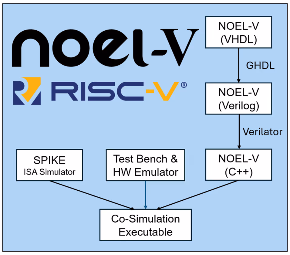Verilator, an open-source tool, converts Verilog designs into cycle-accurate behavioral models in C++. This conversion speeds up simulation and integrates with SPIKE, which is also C++-based. For our VHDL-based NOEL-V design, we use GHDL to convert VHDL code into a Verilog netlist, which then is fed to Verilator. This allows us also to reduce considerably the simulation time, comparing to other HDL simulators.